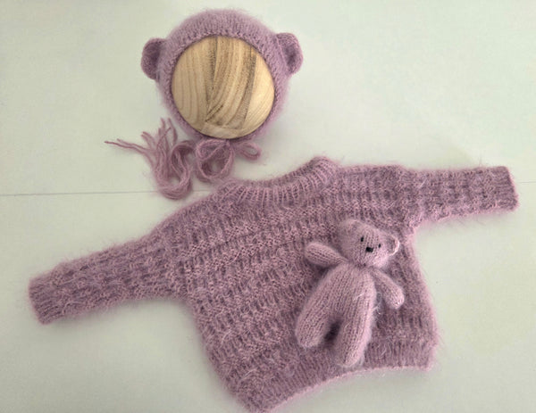 |RTS| Fuzzy Vintage Pink Knit Sweater + Bear Bonnet + Bear Lovie Set